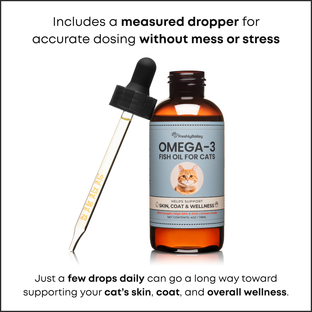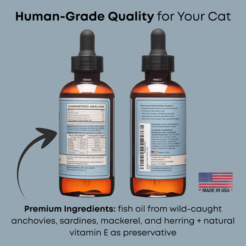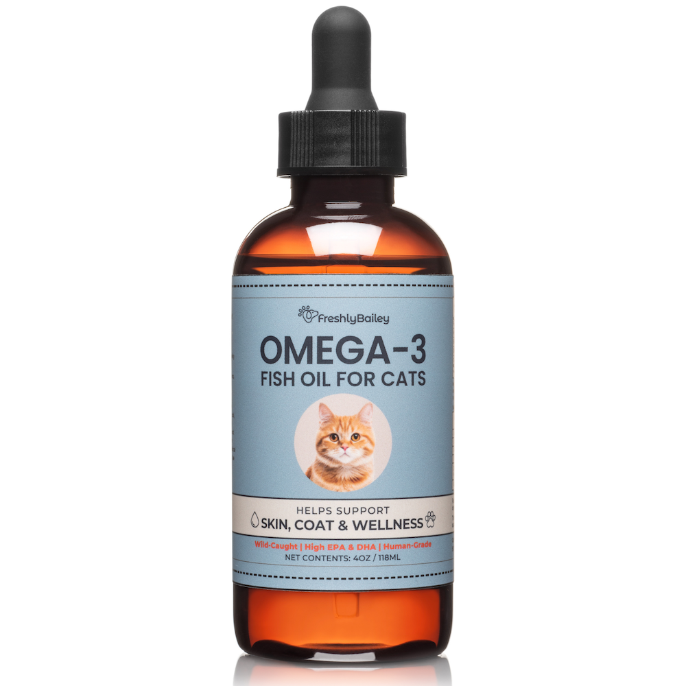 Say goodbye to dull, flaky fur and hello to a softer, shinier, healthier coat—naturally. Freshly Bailey Omega 3 Fish Oil for Cats is a premium skin and coat supplement made specifically for feline wellness. Rich in EPA and DHA, our formula supports healthy skin, reduces dandruff and shedding, and promotes overall vitality.